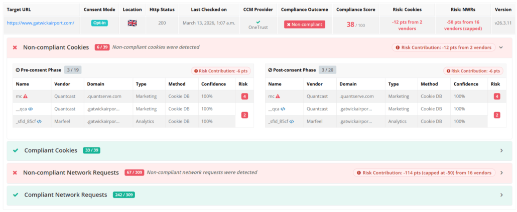 Under ePrivacy Article 5.3, any non-essential technology that stores or accesses information on a user’s device requires prior, informed, active consent. The gap between what the CMP promises and what the website actually does is the regulatory risk we proactively record.