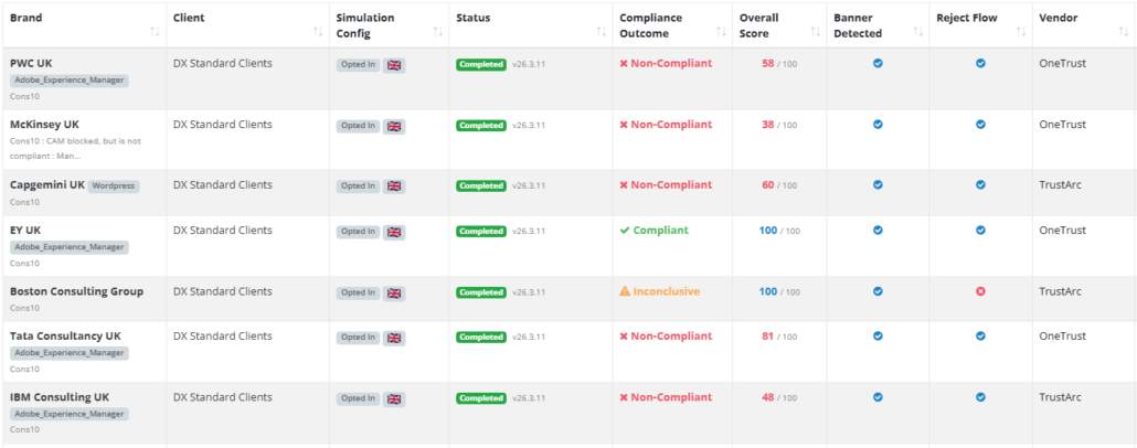 We monitor privacy compliance across enterprise website portfolios including healthcare, pharmaceutical, and technology organisations.