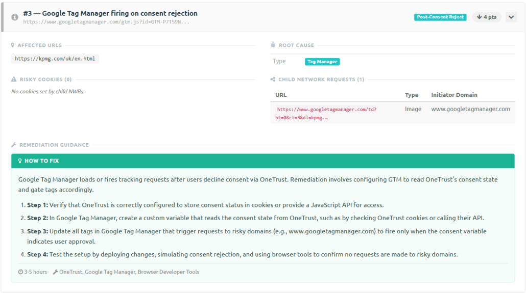 Most compliance tools flag violations without explaining how to fix them. We generate remediation guidance specific to your tag management solution and CMP implementation – identifying the root cause, the affected URLs, and the child network requests involved.